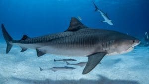 - Tiger Shark (Galeocerdo cuvier): Known for its striking pattern of dark vertical stripes, the Tiger Shark is a versatile predator, earning it the nickname “garbage can of the sea” due to its varied diet. This species is renowned for its curiosity and ability to consume a wide range of prey, including fish, turtles, seabirds, and even debris.