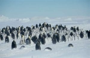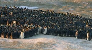 During winter, Emperor penguins form tight circles called huddles. In these groups, they stand close together to share body heat. Meanwhile, penguins on the outside slowly move toward the center to warm up. Then, others take their place on the edge.