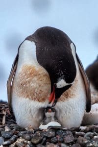 Meanwhile, the male balances the egg on his feet under a warm fold of skin. He does not eat for about two months. Instead, he stands in the cold and protects the egg from freezing.