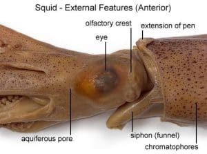 The mantle is the long, tube-shaped body. It holds most of the squid’s organs. For example, the heart, gills, and digestive system are inside it.